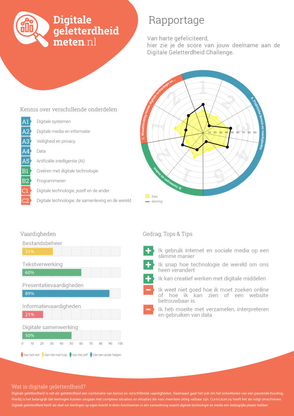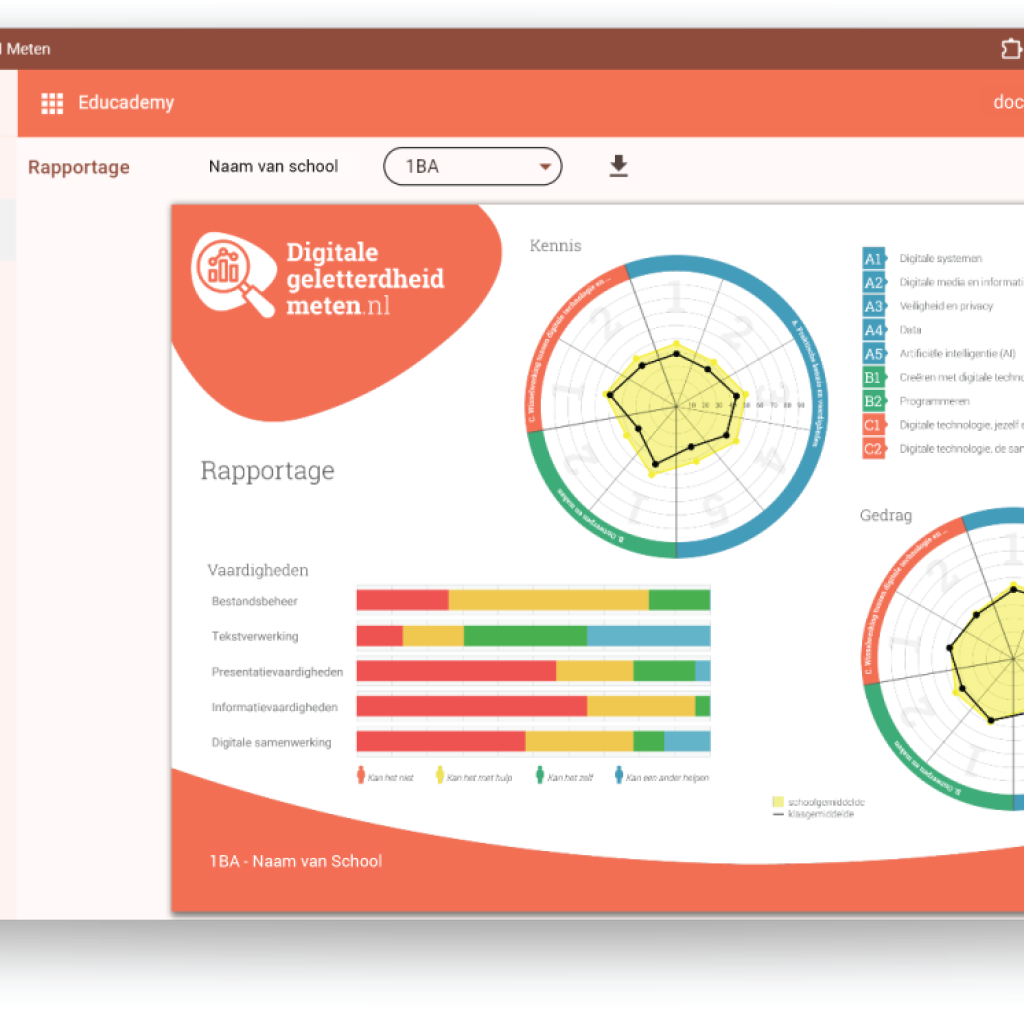 Op de pagina Rapportage kun je per klas de resultaten zien. De resultaten van alle leerlingen die klaar zijn met de meting worden hierin meegenomen. Deze kan dus gedurende de meting veranderen.