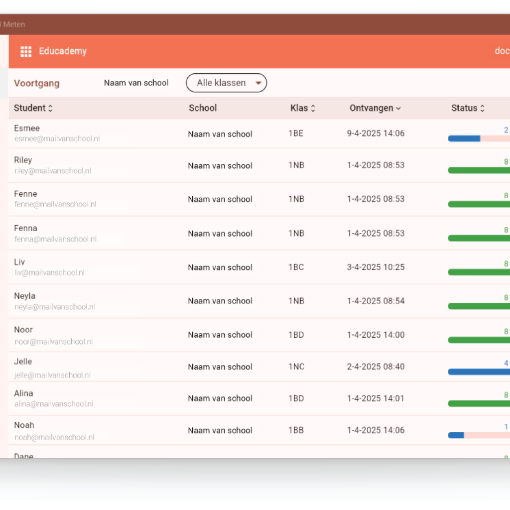 In het menu aan de linkerzijde staan diverse opties. Op de pagina Voortgang is een lijst met deelnemers zichtbaar waarvan je precies kan zien hoe ver ze zijn. Je kan verschillende kolommen sorteren of en klas selecteren.