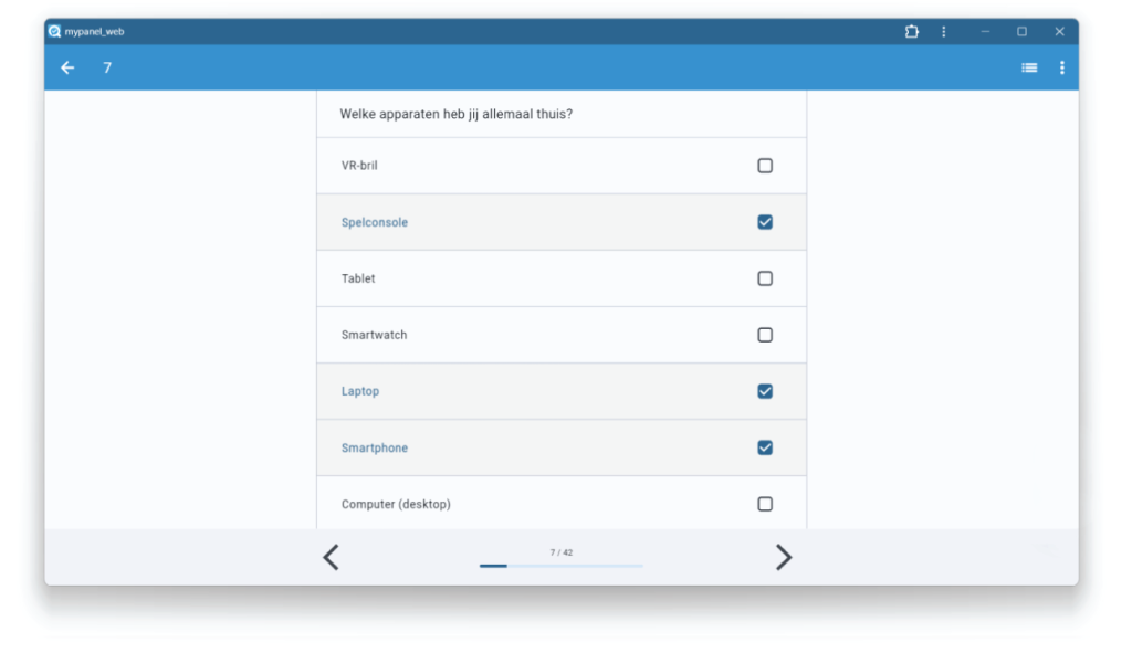 Eenmaal begonnen aan de vragenlijst kom je allemaal verschillende soorten vragen tegen. Soms beantwoord je met een simpel ja of nee en bij andere vragen kun je meer antwoorden kwijt. Elk antwoord is goed, wees vooral eerlijk!